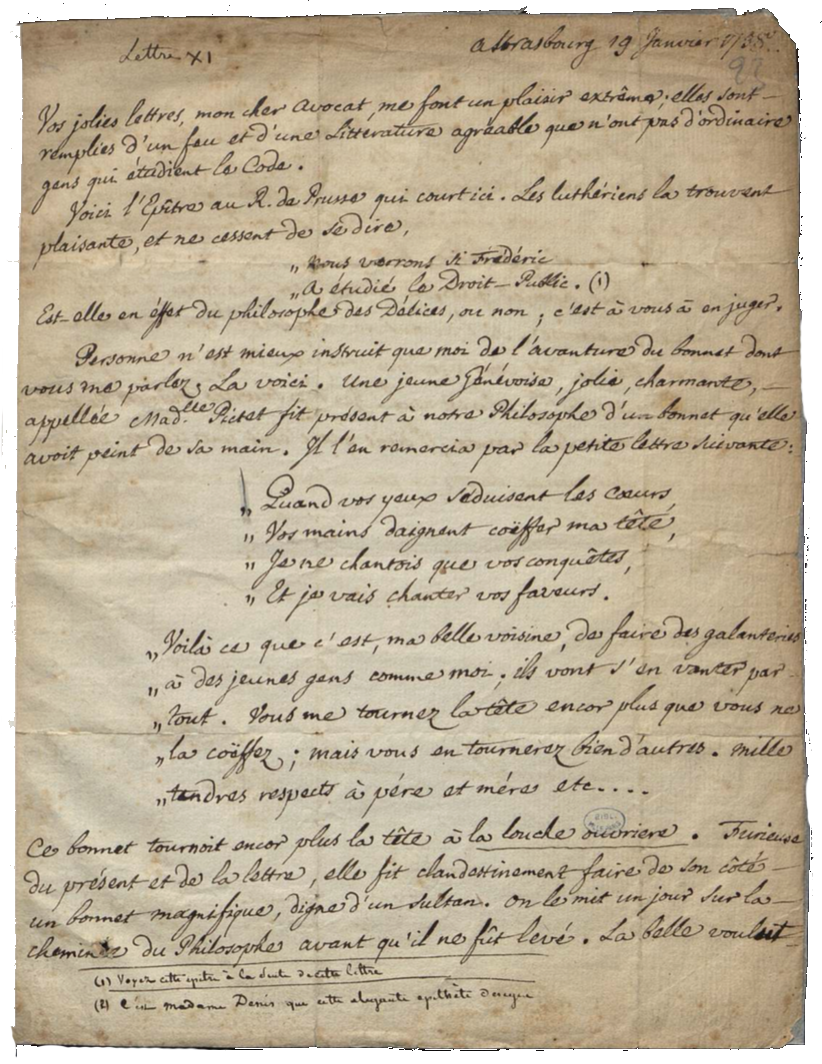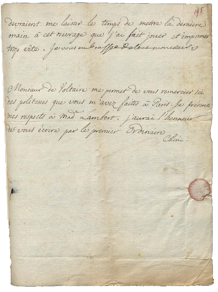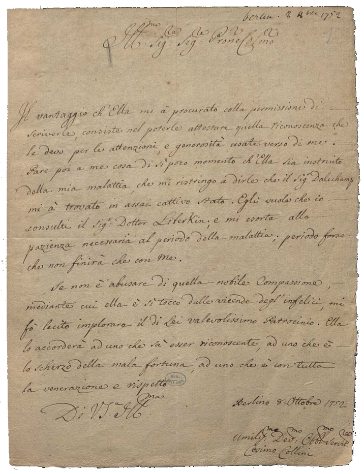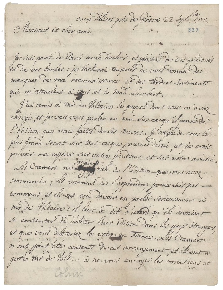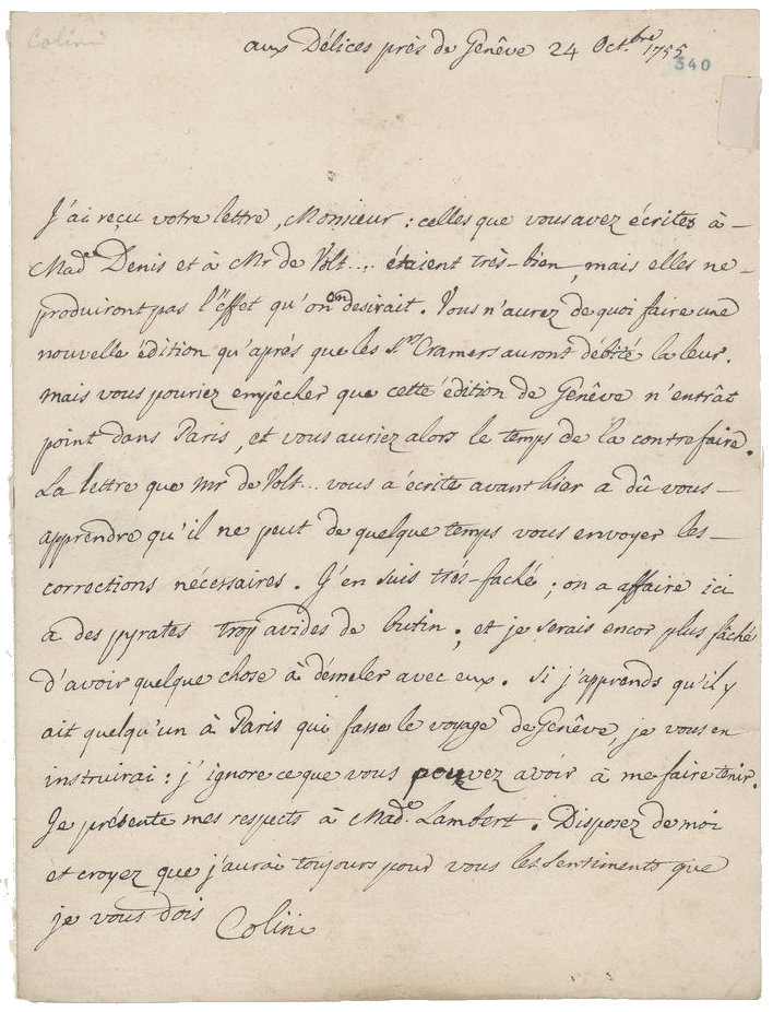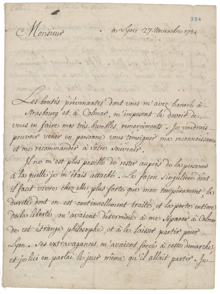 Statut Copiste et secrétaire de Voltaire entre avril 1752 et juin 1756 de 24 à 28 ans. «J’ay deux gens de lettres auprès de moy qui sont mes lecteurs, mes copistes, et qui m’amusent» (D4907, à Richelieu, 10 juin 1752). «Je reste paisible dans le palais de Potsdam, avec deux gens de lettres que j’ai pris pour me tenir compagnie» (D4916, à Mme de Fontaine, 17 juin 1752). «Soyez très persuadé que ny ma nièce ny monsieur Colini ny moy nous ne sortirons que quand il plaira à sa majesté» (D5335, au baron Franz von Freytag, 21 juin 1753). «Mon [secrétaire] Colini écrit très lisiblement. Son écritu[re est] agréable» (D6364, à d’Argental, 30 juillet 1755). «Ce secrétaire par parenthèse est un Florentin très aimable, très bien né, et qui mérite mieux que moi d’être de l’académie de la Crusca» (D6875, à Thieriot, 27 mai 1756). «Il alla donc à Genève avec sa nièce et M. Coligni, son ami, qui lui servait de secrétaire, et qui a été depuis celui de monseigneur l’électeur Palatin et son bibliothécaire» (Commentaire historique sur les uvres de l’auteur de la Henriade, 1776 rédigé par Voltaire à la troisième personne). Dates et activités Collini entra au service de Voltaire le 10 avril 1752 à Potsdam (Collini 1807, p. 30). Il fut renvoyé des Délices au début de juin 1756 (Collini 1807, p. 170-177). La dernière lettre connue de sa main est D6881, du 4 juin 1756, écrite au nom de Voltaire; il quitta Genève le 12 juin (Collini 1807, p. 185). Le 9, Voltaire cherche «un domestique intelligent et qui même sût un peu écrire» (D6884). Devenu «secrétaire intime» de l’électeur palatin Charles-Théodore en janvier 1760, Collini a pu être amené à copier des écrits communiqués par Voltaire au prince: on ne peut pas exclure a priori que des documents se retrouvent qui seraient de sa main et postérieurs à juin 1756 mais aucun cas n’en a été signalé à ce jour. Collini aurait succédé à Tinois (Collini 1807, p. 26-28) mais les dates ne concordent pas exactement. Francheville étant déjà en place, il lui fut d’abord associé (p. 26, 30-34 et 51-52): ce sont eux, les «deux gens de lettres» des citations ci-dessus. Il eut aussi des «fonctions de lecteur»: il précise qu’il lisait à Voltaire le soir Boccace et l’Arioste (p. 32). Peu avant le départ de Prusse, au plus tard en mars 1753, Francheville devant rester à Berlin, Collini se vit adjoindre un copiste recruté sur place, dont il parle trois fois sans le nommer (Collini 1807, p. 72, 130 et 142): il s’agit de Villaume, l’un des moins connus des copistes de Voltaire, dont l’écriture a toujours été confondue avec celle de Collini (voir ci-dessous). Enfin, Wagnière à ses débuts assistera Collini, en 1754, mais surtout après juin 1755, Villaume ayant alors été rappelé à Berlin. Wagnière n’est pas mentionné par Collini lequel reçut pourtant plusieurs lettres dictées à son successeur. Collini dit avoir eu comme «premier travail» la copie d’un manuscrit intitulé «Campagnes de Louis XV» il s’agit de l’Histoire de la guerre de 1741, refondue en 1769 dans le Précis du siècle de Louis XV. C’était, précise-t-il, «un fonds de travail» à reprendre et continuer dans les intervalles de la copie ordinaire (Collini 1807, p. 30). Il décrit «[s]a tâche de tous les jours» en ces termes: «Des pièces fugitives, des ouvrages commencés et des lettres à écrire sous [l]a dictée» (p. 30-31). Il indique avoir réalisé avec Francheville plusieurs copies du Poème sur la religion naturelle, de L’Orphelin de la Chine et de La Pucelle (Collini 1807, p. 31). Pour le premier de ces titres, il mentionne une copie faite à Gotha au printemps 1753, avec nouvelle dédicace transférée du roi de Prusse à la duchesse de Saxe-Gotha manuscrit qu’il a conservé, dit-il, et qui avait pour seul titre «La Religion naturelle» (p. 66). Autour des deux éditions du Siècle de Louis XIV faites à Berlin et Dresde en 1751-1752, il fait état d’une intense activité de l’auteur et de «ses deux secrétaires» (Collini 1807, p. 31-32) les manuscrits conservés en font foi. Il relate la genèse du Dictionnaire philosophique, fruit d’une idée lancée à la table du roi à Potsdam le 28 septembre 1752, aussitôt prise au sérieux par Voltaire (p. 32): Collini en aurait par la suite «mis en ordre [l]es brouillons» (p. 33) mais ce passage n’est pas clair. Un état ancien de l’article «Âme» est de la main de Villaume, donc plus tardif: voir ma présentation de ce manuscrit dans l’édition du Dictionnaire philosophique de Gerhardt Stenger (GF, 2010), p. 593-598. Collini mentionne encore, à la fin de 1752, les écrits polémiques autour de l’Akakia (p. 33-34 et 45); et pour les premiers mois de 1753, le Supplément au Siècle de Louis XIV (p. 58-59), le quinzième chant de la Pucelle (p. 59-60), «les Voyages de Scarmentado» et «des additions considérables au roman de Zadig» (p. 61). Il explique avoir travaillé de bout en bout aux Annales de l’Empire, du recueil des matériaux réunis à Gotha (p. 66) à la première impression réalisée en Alsace en 1754, dont il supervisa l’achèvement (p. 130-139). Ses derniers chantiers de copie et de mise au net furent, en 1754-1755, les «Campagnes de Louis XV», reprises pour contrer une édition subreptice (p. 139, 150-152 et 161-162), et la première édition collective des Cramer (56G), qui allait paraître en 1756 (p. 163-164). En 1754-1755, il a également prêté la main aux travaux littéraires de Mme Denis, comme «confident et copiste de ses ouvrages dramatiques», écrit-il, dont «une tragédie d’Alceste» (p. 171) ces écrits sont attestés. Informations personnelles Né le 14 octobre 1727 à Florence; mort le 21 mars 1806 à Mannheim. Florentin lettré, de très bonne famille, il a interrompu ses études de droit après la mort de son père sans prendre ses degrés de doc